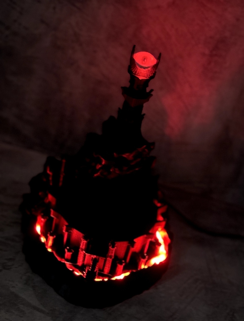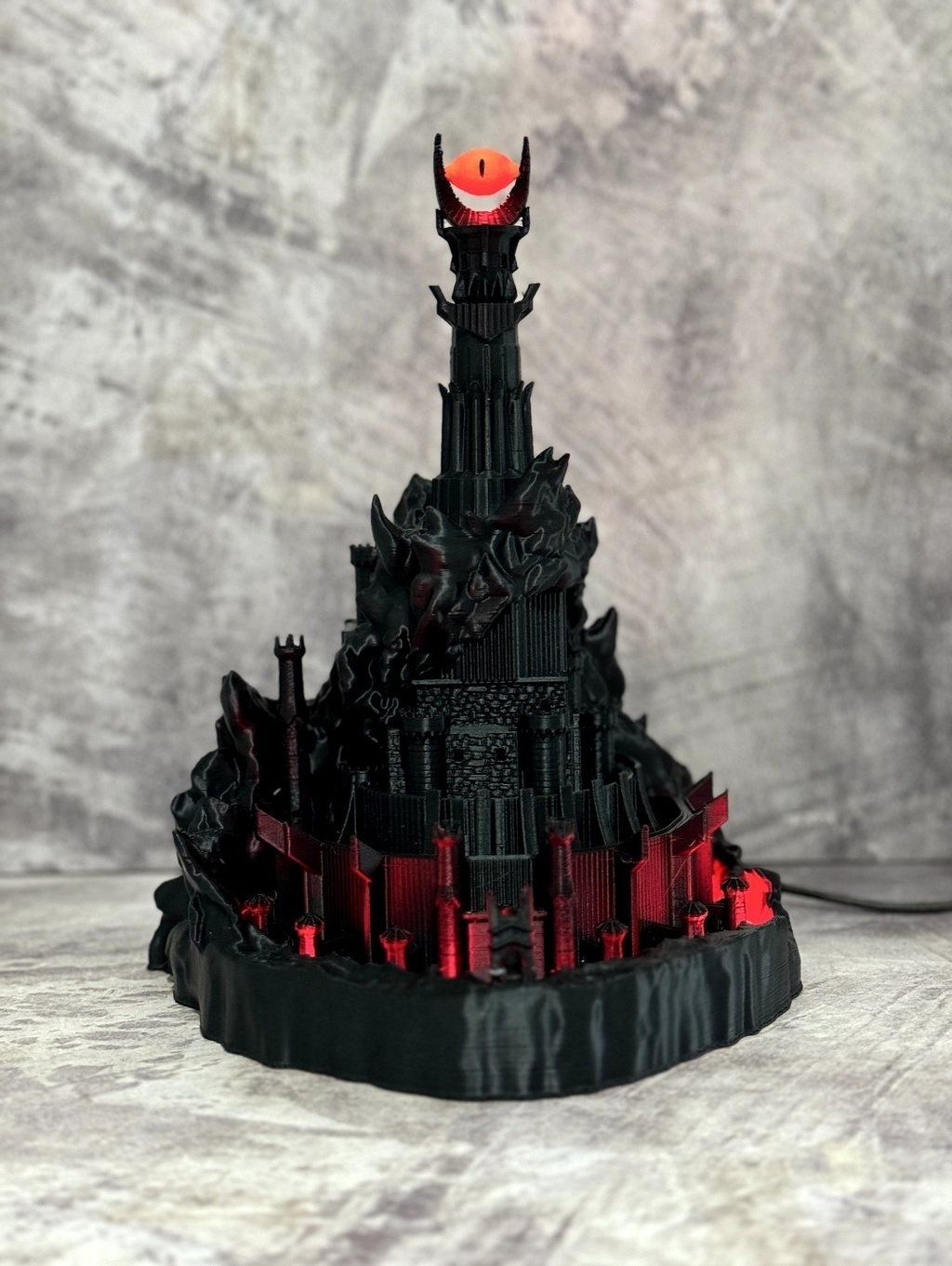 Lámpara Barad-Dur (ojo de Sauron)Ilumina tu hogar con la Lámpara Barad-Dur, una pieza única realizada mediante impresión 3D de plástico que combina arte y tecnología. Este diseño exclusivo hará que cualquier espacio se transforme en un ambiente mágico y cautivador.Características:Eléctrica y lista para usar: Incluye una tira LED fija en su interior, que garantiza una iluminación eficiente y duradera.Fuente de alimentación incluida: Viene con una fuente para enchufar en la corriente, facilitando su uso inmediato.Dimensiones: Alto 23 cm - Diámetro inferior 18 cm, ¡ideal para cualquier rincón de tu hogar!Con su diseño innovador y funcional, la Lámpara Barad-Dur no solo es una fuente de luz, sino también una pieza decorativa que atraerá todas las miradas. No te pierdas la oportunidad de tener esta lámpara emblemática y transforma tu espacio en un reino de fantasía. ¡Adquiere la tuya ahora y dale un toque especial a tu hogar!